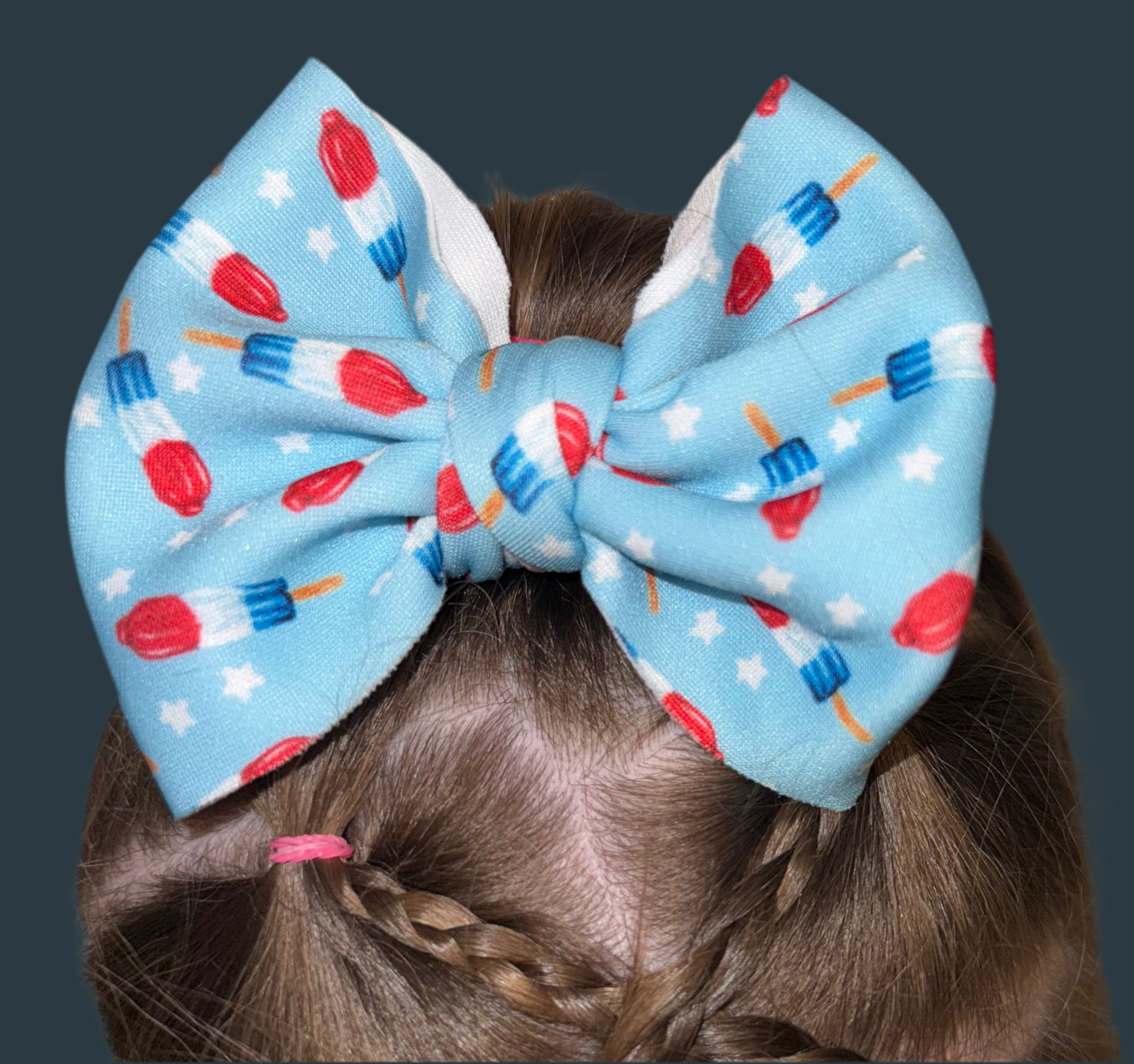 Let your little firecracker shine with our Bomb Pop Bow! Bursting with red, white, and blue popsicles on a soft sky-blue background, this bow is the ultimate accessory for summer fun, 4th of July parades, and popsicle-loving cuties.